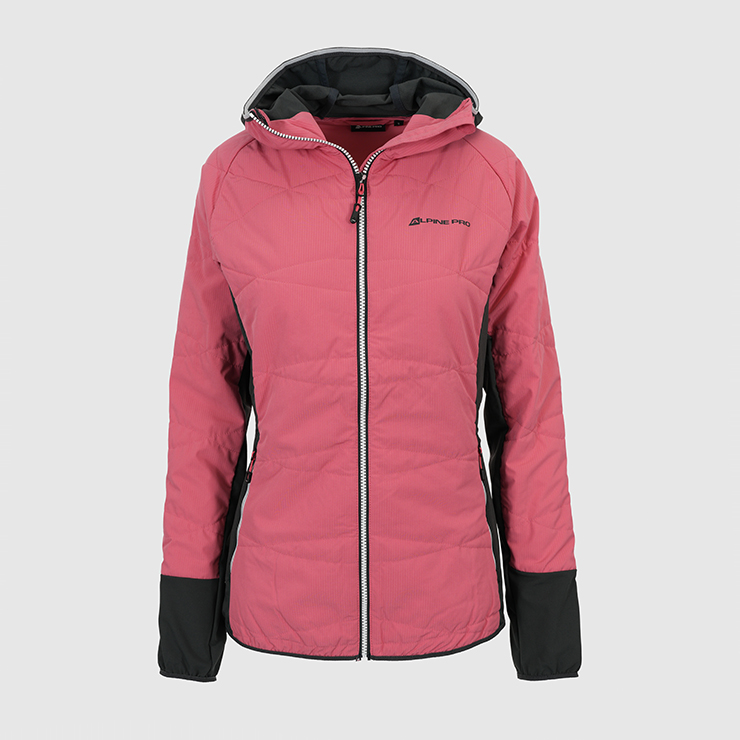 Kurtka hybrydowa - ochrona przed chłodem jak i wysoka oddychalność. Kolorowe panele wypełnione są lekką ociepliną. Materiał zewnętrzny zabezpieczony powłoką DWR. Wyposażona w kaptur, dwie kieszenie boczne zapinane na zamek oraz elementy odblaskowe. Kolor różowy.