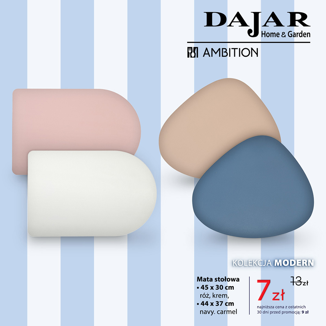 Mata stołowa 45 cm x 30 cm w kolorze różowym lub kremowym oraz 44 cm x 37 cm w kolorze granatowym lub karmelowym: było 13 zł, jest 7 zł.