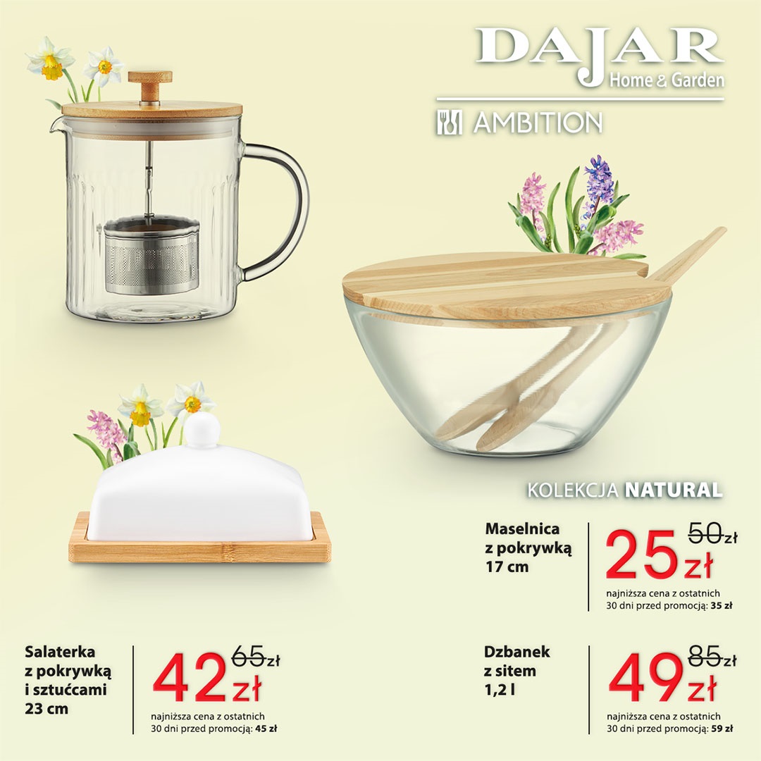 Salaterka z pokrywką i sztućcami 23 cm: było 65 zł, jest 42 zł. Maselnica z pokrywką 17 cm: było 50 zł, jest 25 zł. Dzbanek z sitem 1,2 l: było 85 zł, jest 49 zł.