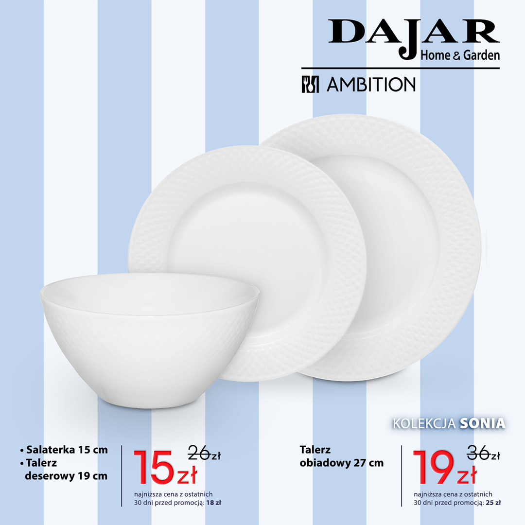 Salaterka 15 cm oraz talerz deserowy 19 cm: było 26 zł, jest 15 zł. Talerz obiadowy 27 cm: było 36 zł, jest 19 zł.