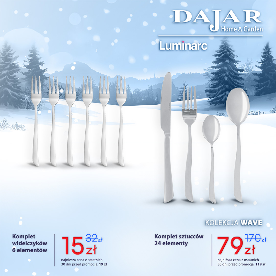 Komplet widelczyków 6 el: było 32 zł, jest 15 zł. Komplet sztućców 24 el.: było 170 zł, jest 79 zł.