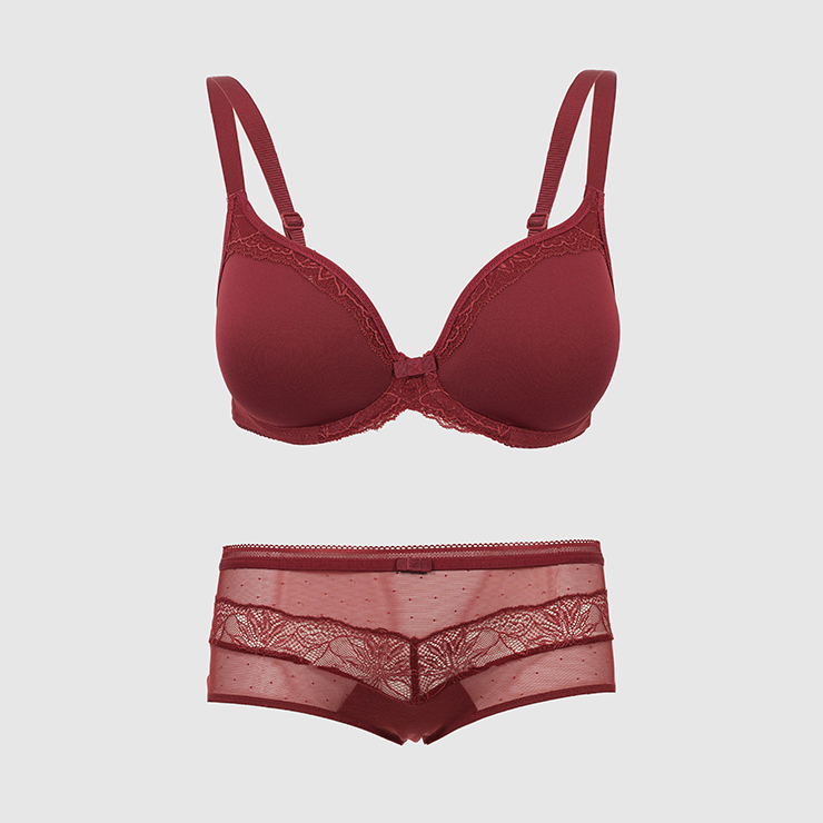 Bordowy zestaw: biustonosz: było 320 zł jest 220 zł, majtki: było 160 zł jest 110 zł.