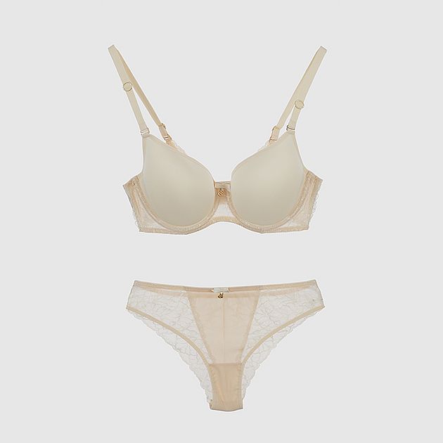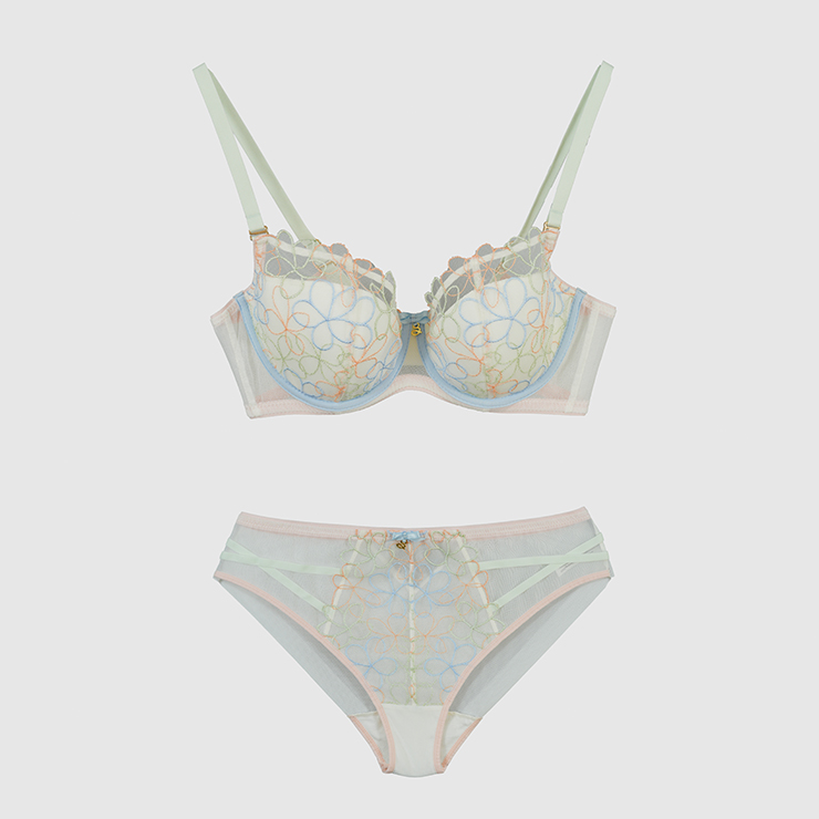 Pastelowy komplet bielizny. Biustonosz: było 279 zł, jest 159 zł. Figi: było 195 zł, jest 111 zł.