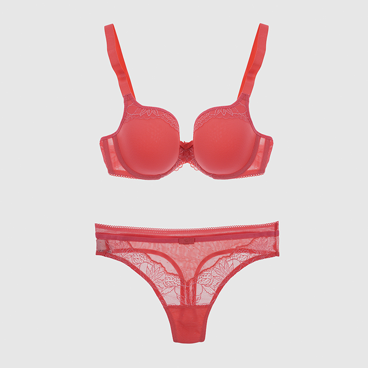 Pomarańczowy komplet bielizny. Biustonosz: było 320 zł, jest 102 zł. Stringi: było 140 zł, jest 39 zł.