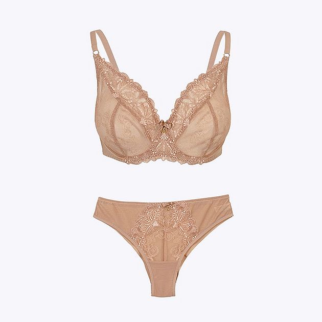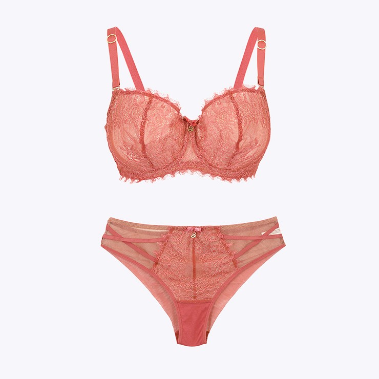 Komplet w kolorze różanym. Biustonosz: 249 zł, jest 174 zł. Tangi: było 149 zł, 104 zł.
