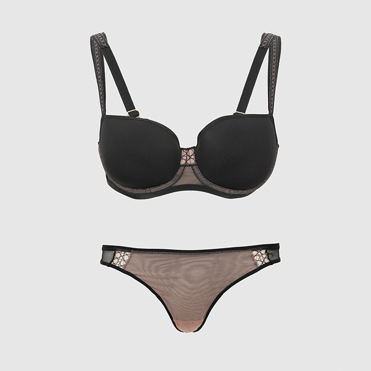 Bordowy zestaw: biustonosz: było 240 zł jest 168 zł, majtki typu stringi: było 90 zł jest 63 zł.