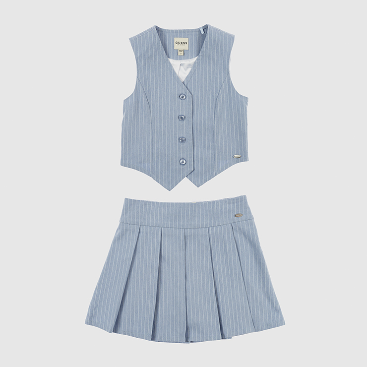 Niebieski komplet dziecięcy. Kamizelka: było 335 zł, jest 219 zł. Spódnica: było 305 zł, jest 199 zł.