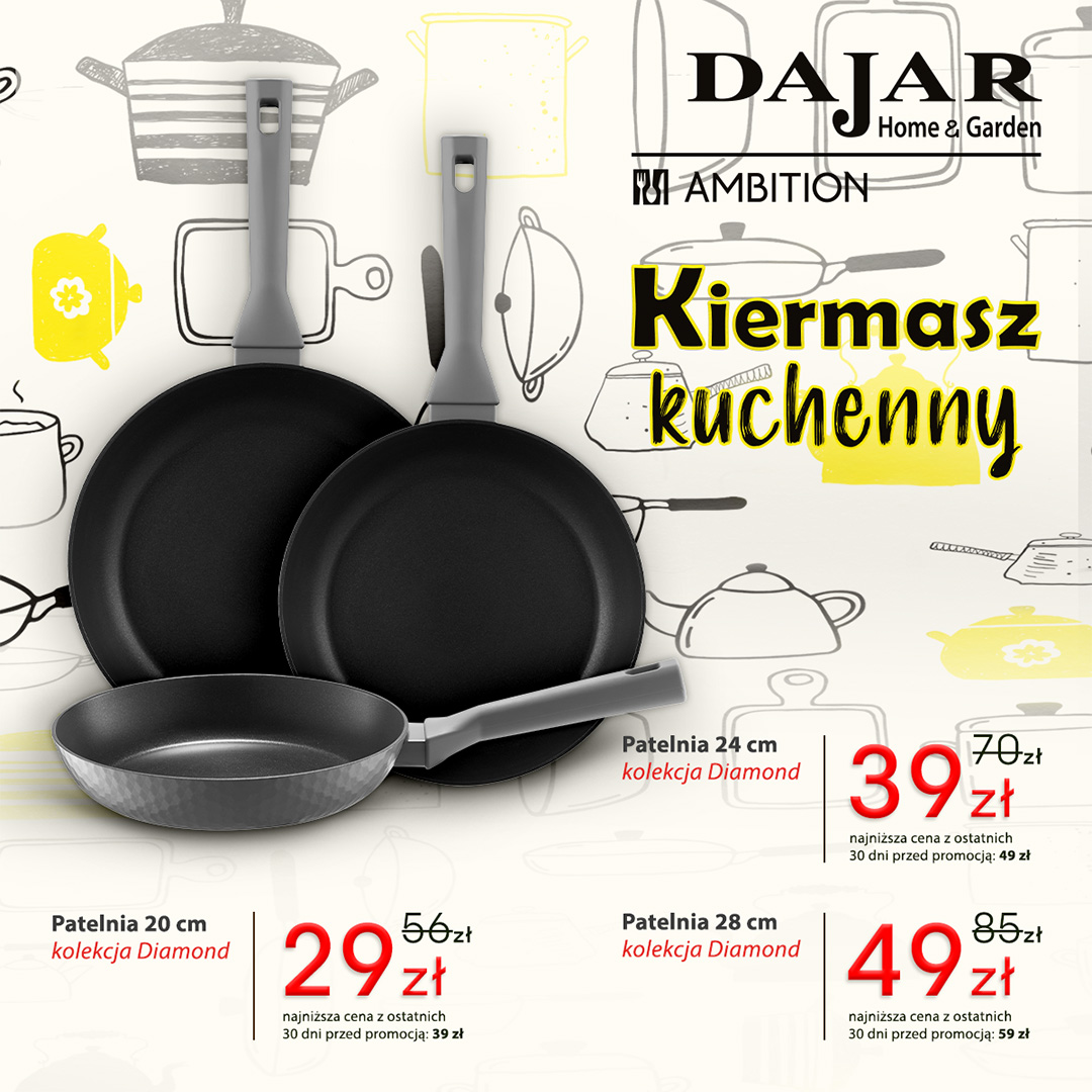 Patelnia 20cm: było 56zł, jest 29zł. Patelnia 24cm: było 70zł, jest 39zł. Patelnia 28cm: było 85zł, jest 49zł.