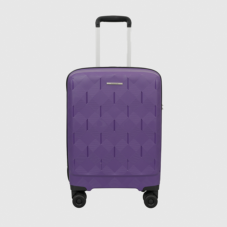 Walizka z polipropylenu, lekka oraz odporna na zarysowania i uszkodzenia, wymiar bagażu podręcznego. Kolor fioletowy.