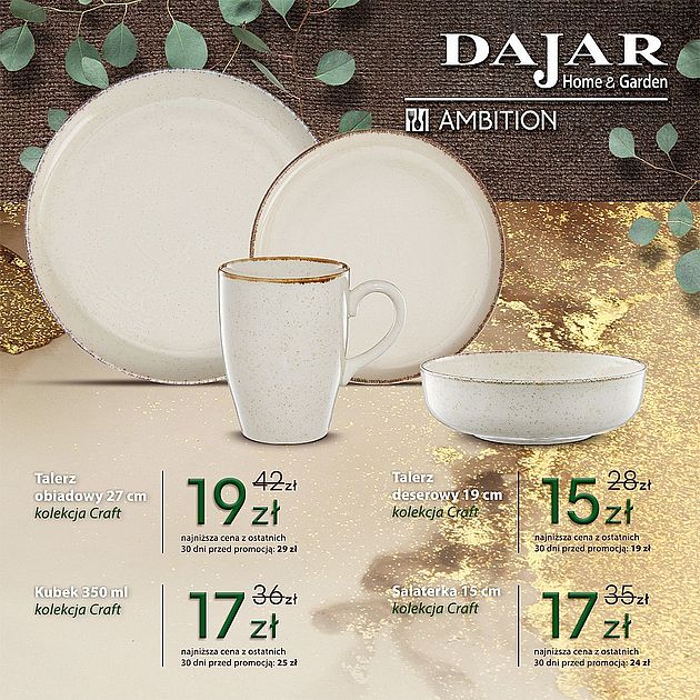 Talerz obiadowy 27cm: było 42zł, jest 19zł. Talerz deserowy 19cm: było 28zł, jest 15zł. Salaterka: było 35zł, jest 17zł. Kubek 350ml: było 36zł, jest 17zł.